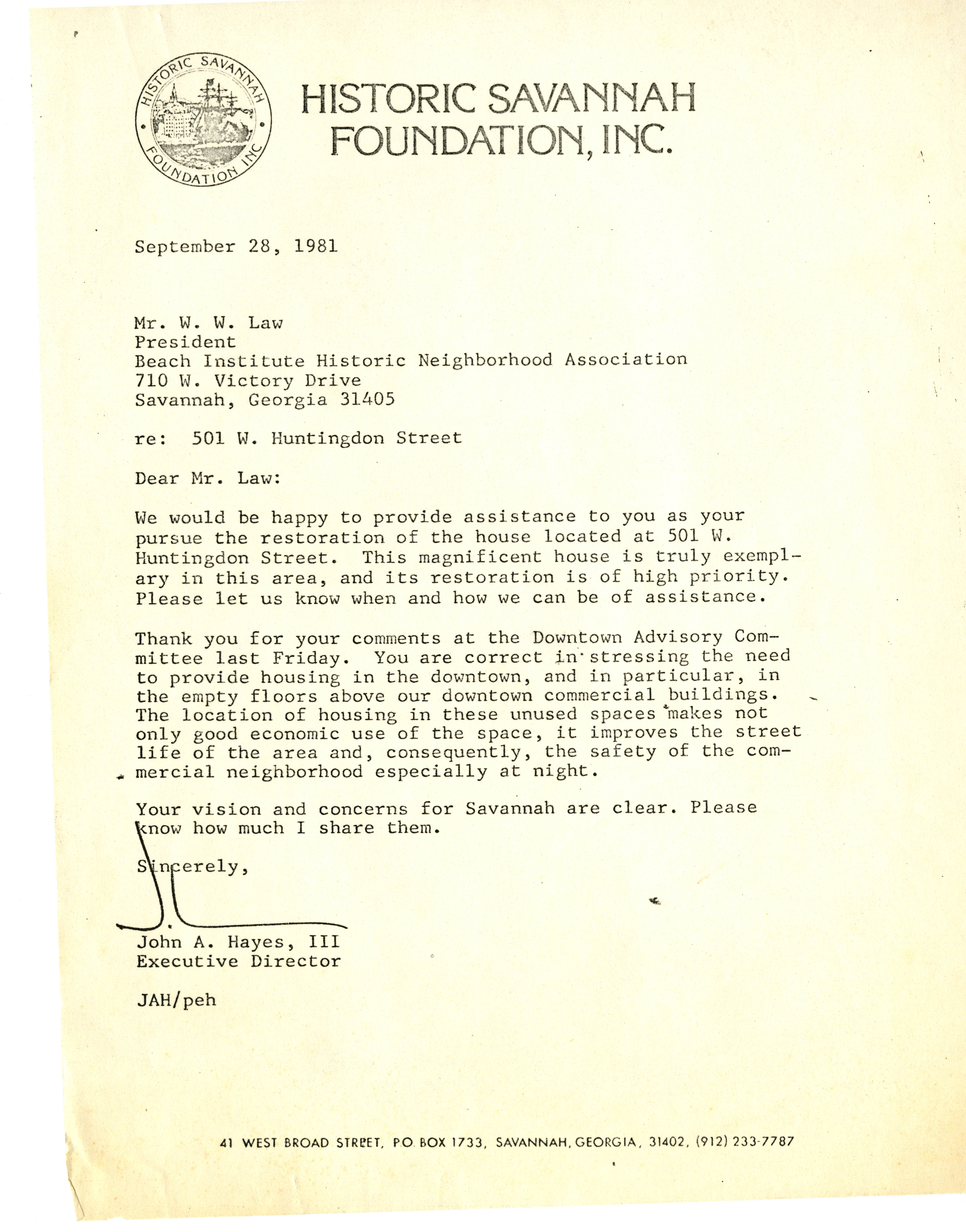 Historic Savannah Foundation Letter - addressing the need for downtown second-floor housing - W. W. Law Working Files