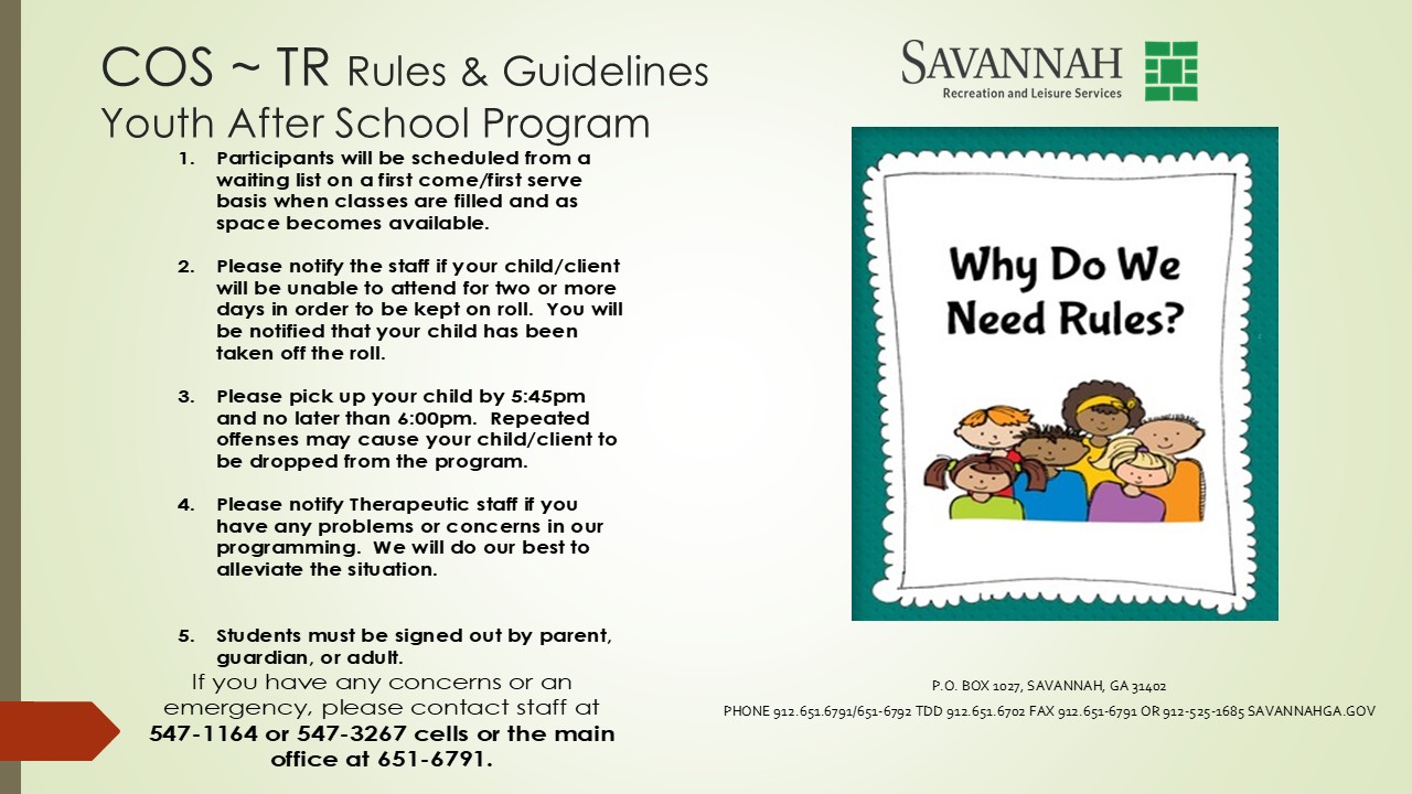 The Therapeutic Recreation Program is a division of the City of Savannah Recreation & Leisure Services Department, which provides recreational activities and opportunities to improve fitness, health, and well-being for intellectually and physically challenged citizens.
