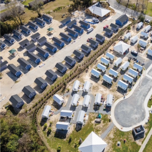 Dundee Cottages sits adjacent to the inaugural housing initiative, the Cove at Dundee. The Cove at Dundee, originally Savannah’s Veterans Tiny House Project, was Georgia’s first of its kind, led and operated by CSAH and has become a national model for housing veterans experiencing homelessness. With 46 tiny homes and community amenities, it has housed over 165 veterans.
